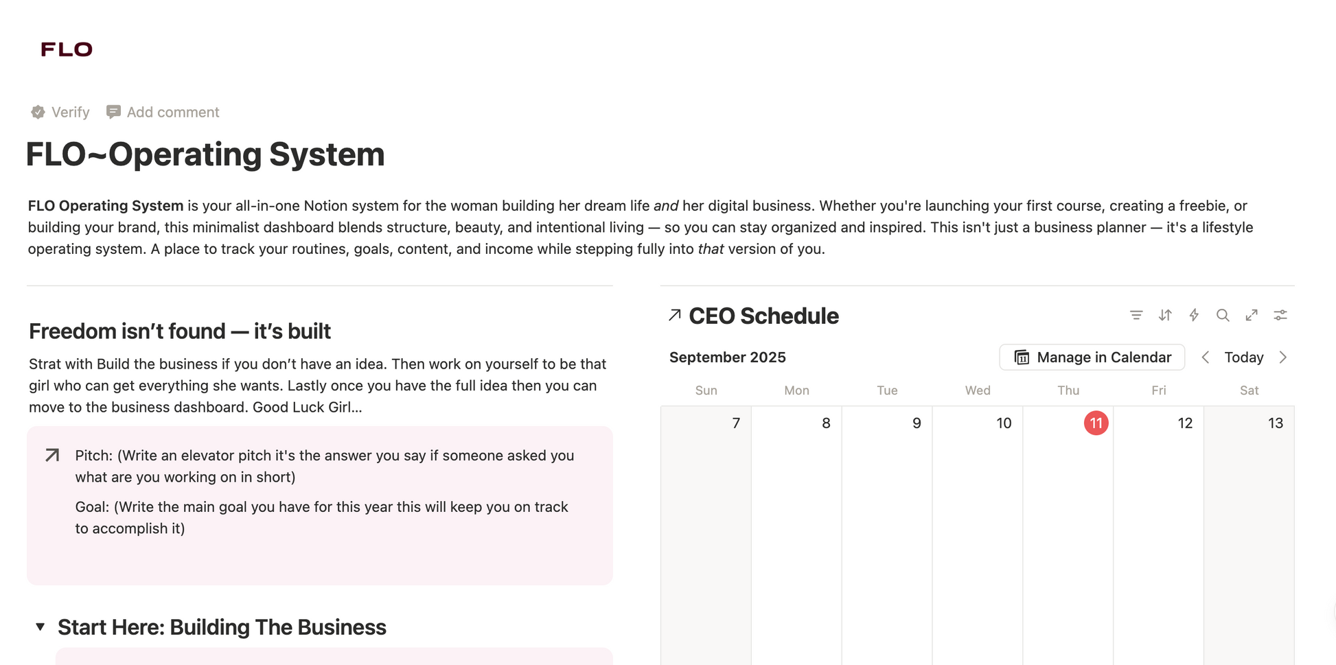 FLO Operating System is your all-in-one Notion system for the woman building her dream life and her digital business. Whether you're launching your first course, creating a freebie, or building your brand, this minimalist dashboard blends structure, beauty, and intentional living — so you can stay organized and inspired. This isn't just a business planner — it's a lifestyle operating system. A place to track your routines, goals, content, and income while stepping fully into that version of you.